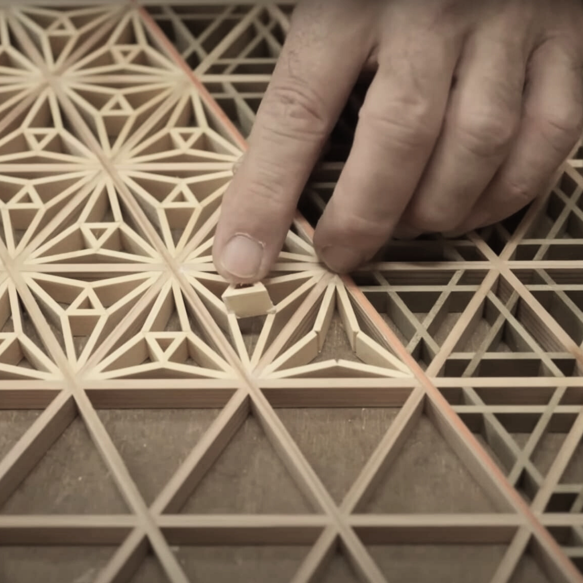 Su estructura se construye a partir de líneas radiales de base hexagonal, triángulos equiláteros y patrones repetitivos que crean una sensación de orden, ligereza y equilibrio visual.